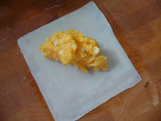 Egg wash the edges of the wonton wrappers and place a small amount of the cooled filling in the middle: