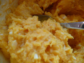 Mash the first five ingredients together until it looks like creamy mashed potatoes. Set aside and let cool.