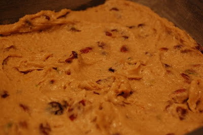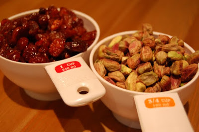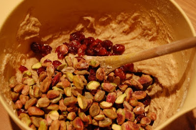 3. Add salt, stir in flour. Mix in 1/2 cup of dried cranberries and 1/2 cup unsalted pistachios.