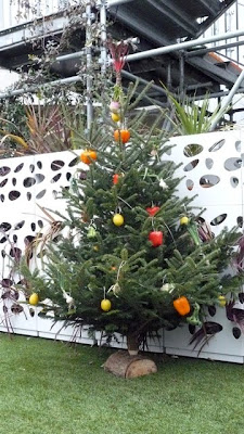 Upon arrival on the rooftop courtyard of the Palais de Tokyo, we were greeted by a cheery culinary Christmas tree (complete with vegetable ornaments – of course!) and then braved a walk on the dodgy (wet) catwalk to the glass & steel cube in the sky.