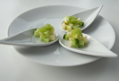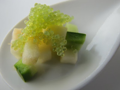 After we were all settled at the communal table (the two of us right at the river’s edge) and had admired the view, our cuisine experience began with a delightful amuse-bouche of diced green apple and pear with pieces of brunoisde horseradish and topped with green flying fish roe. Wonderful sharp/sweet/salt combination married beautifully.