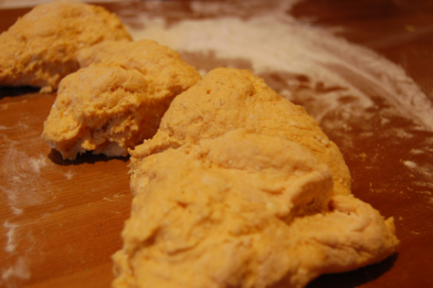 1. Combine ricotta, pumpkin parmagiano, yolk, zest and salt in large bowl. Mix well. Sprinkle half of the flour on the mixture, gently turn with spatula a few times to incorporate. Dump mixture on clean, lightly floured countertop or you can still do this in the bowl. Sprinkle remaining flour on top of the mixture. Gently knead with your fingertips, just bringing together the mixture until flour is incorporated through. This only should take a minute or two. Any longer and you will be over-kneading.
