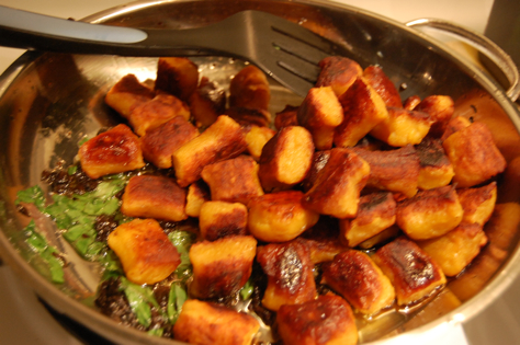 Pan-fried pumpkin gnocchi (from Steamy Kitchen) with truffle paste and basil
