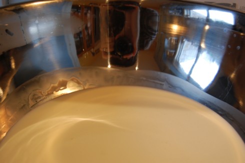 Bring 1 inch of water to a boil in a wide skillet. Reduce the heat to medium-low so the water is barely simmering. Pour the cream into a medium heat-resistant bowl, then place the bowl into the skillet. Heat the cream, stirring often, to 190 F. If you do not have a thermometer, wait until small bubbles keep trying to push up to the surface.
