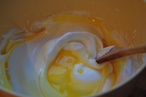 In a small bowl, beat the egg yolks lightly with a fork and fold them into the meringue, using a wooden spoon. Sift the flour over this mixture and fold gently until just mixed. It is important to fold very gently and not overdo the folding. Otherwise the batter would deflate and lose volume resulting in ladyfingers which are flat and not spongy.