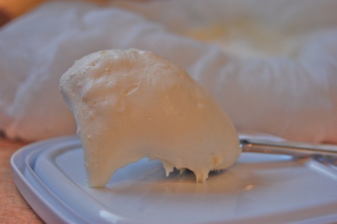 It will take about 15 minutes of delicate heating. Add the lemon juice and continue heating the mixture, stirring gently, until the cream curdles. Do not expect the same action as you see during ricotta cheese making. All that the whipping cream will do is become thicker, like a well-done crème anglaise. It will cover a back of your wooden spoon thickly. You will see just a few clear whey streaks when you stir. Remove the bowl from the water and let cool for about 20 minutes. Meanwhile, line a sieve with four layers of dampened cheesecloth and set it over a bowl. Transfer the mixture into the lined sieve. Do not squeeze the cheese in the cheesecloth or press on its surface (be patient, it will firm up after refrigeration time). Once cooled completely, cover with plastic wrap and refrigerate (in the sieve) overnight or up to 24 hours.