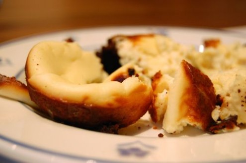 Do not remove the cheesecakes from the pans before they are completely cooled, otherwise this happens and you will be forced to taste them.