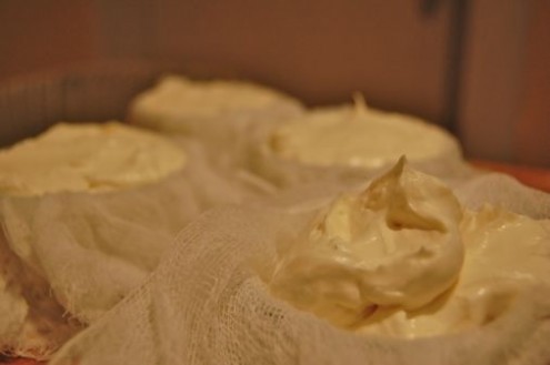 Line molds (coeurs or otherwise) with damp cheesecloth, being sure to bang down the mixture to reach all edges of the mold.