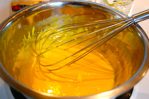 Whisk the egg yolks in a stainless steel bowl for a couple of minutes, until the it is light and foamy (note: my yolks were so thick they never really got “light and foamy” but it still worked!)