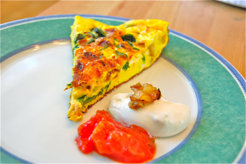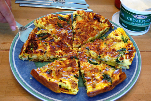Cathy and Steve chose potatoes, spinach and yellow onions from the list and in a twist of fate, selected eggs, salsa and lemon juice. Of course they chose to make a frittata (I could say they took the easy route but it was so delicious that I won’t!):