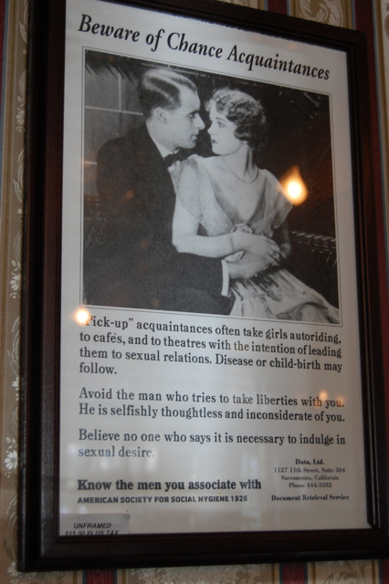 Oh my gosh, I LOVE that one sign! “BEWARE Pick-Up Acquaintances! Pick-up Acquaintances often take girls autoriding…Disease or childbirth may follow” Too funny! Makes you wonder if parents told their daughters anything in those days if they felt the need to post these PSAs 🙂