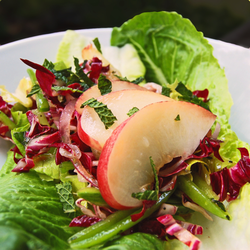 âGarden greens are abundant throughout the summer and into early fall. A variety makes this salad interesting both in texture and colour. When mixed with fresh nectarines and finished with a zesty dressing, it comes alive and tickles the senses!â â Chef Mark Picone, Vineland, ON