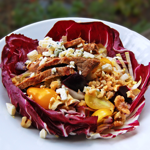 Because I had gone (ahem!) a little bit overboard when buying the beets, I had plenty of leftovers, so I added them into a simple salad a couple of days later. I combined the beets with radicchio, endives, sweet yellow grape tomatoes from our garden, some crumbled blue cheese, chopped California Walnuts (also an IFBC sponsor!) and some thinly sliced grilled steak.
