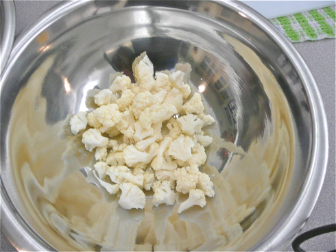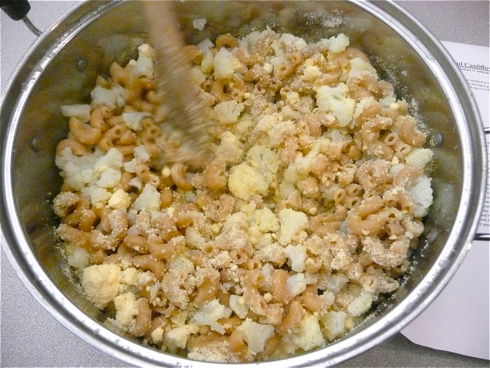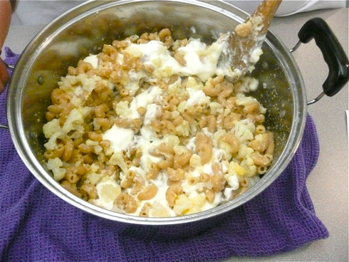 Once the pasta was cooked, the cauliflower cut up and the cheese grated, we stirred in some (pre-grated) parmesan…