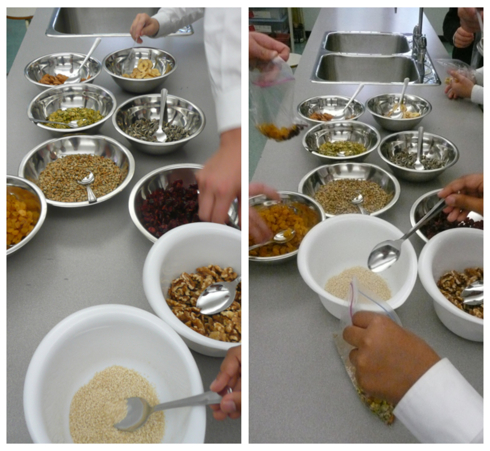 I had brought along a number of choices for the boys to include: cranberries, golden raisins, banana chips, almonds, walnuts, coconut, sesame seeds, pumpkin seeds and sunflower seeds…