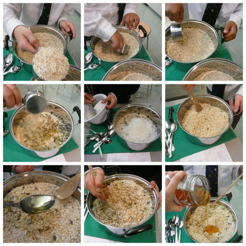 Err, yes, those are whole sunflower seeds as well as shelled ones – I mistakenly bought unroasted ones (knowing how much the boys love the little packs of roasted ones you can get, I figured it would be a fun addition. T’was only when we added them to the base and the kitchen asked me had I really meant to, did I start to wonder). Meanwhile, back in the science lab, the boys were eating them regardless. In fact they were snacking on everything… I removed them from most boys portions but many of them insisted on keeping them in and that they were “fun” to eat. Ok then… Sometimes, you know, cooking with 7 little boys can make you flustered….