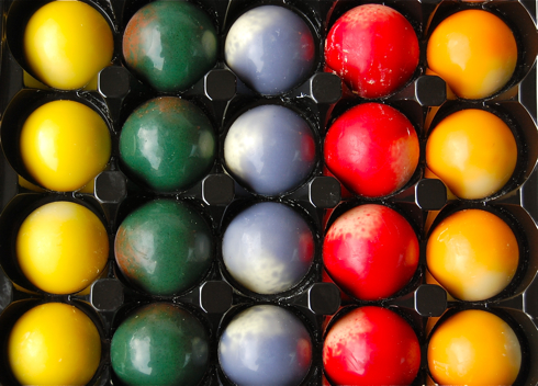 Yes, these are chocolates – coloured white chocolate filled with not jelly but more like fruit paste. These were not only one of the most eye-catching products, they were also a favourite, both at our party and in my staff room…