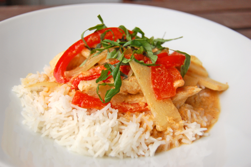 As soon as I laid eyes on the November issue of Bon Appétit, I knew that the RSVP recipe I would make would the the Panang Curry. Around the time that issue arrived, I was extremely busy at work and with grad school (oh, you know and the blog!) and was making large batches of food ahead of time so that we would have proper food through the week for dinner and so that Neil would not have to raid the vending machine for lunch. I whipped this curry up in about 10 minutes, so fast, in fact, that Neil had no idea I had even made it so the day I sent it for lunch, he emailed me “I don’t know where that curry came from but it was GOOD!”. It’s rare that a lunch merits an email so I knew this was a winner!