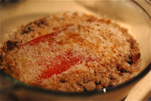 It’s a pretty easy process. First you cure the salmon in salt and spices/ flavourings. We followed the recipe in Charcuterie using kosher salt, pink salt, dark brown sugar, pepper, all spice, bay leaves, cloves and mace. Since I was responsible for this and my head still isn’t quite right, I forgot the rum 🙁 Next time…