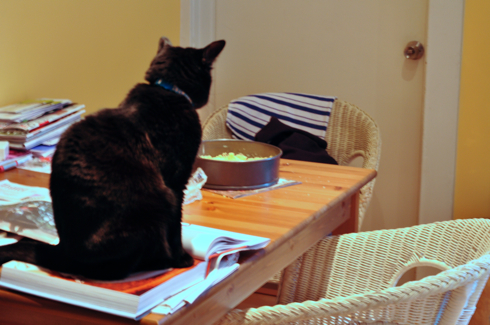 That cat picture totally reminded me of cooking at a friend’s house and the cat wouldn’t leave me alone!! Your cake looked good, pressed-in crust or not.
