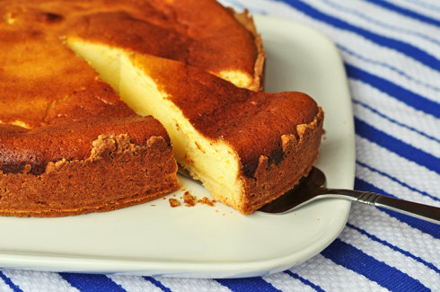 I approached this week’s French Fridays with Dorie with a little bit of trepidation. A Tourteau de Chèvre is basically a baked cheesecake, made with goat’s cheese. No, it wasn’t the goat’s cheese part that worried me, it was the “baked cheesecake” part. Oh, I’ve made them before – but as you can see in this post and this one, I was not successful in producing a cheesecake that didn’t crack when baked. So I was worried. Until I looked at Dorie’s picture and saw that this one is supposed to be cracked and kind of ugly on the top… A perfect baked cheesecake recipe for me then!