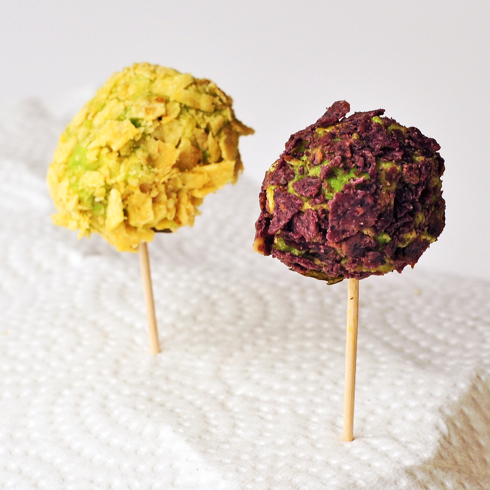 I had one tiny avocado leftover from my guac experiment so I made a simple guacamole, popped it in the fridge for 15 minutes or so, then rolled tiny balls and coated them in crushed tortilla chips – blue and yellow. I think they are a really fun way to serve guacamole at a party – so much less mess!