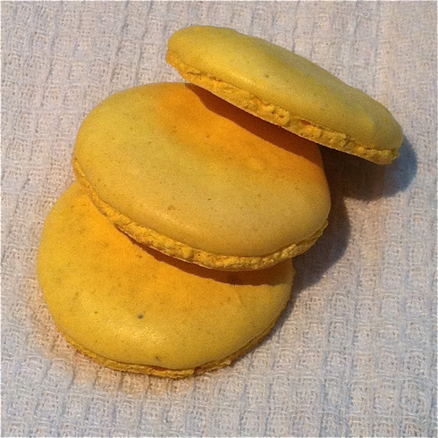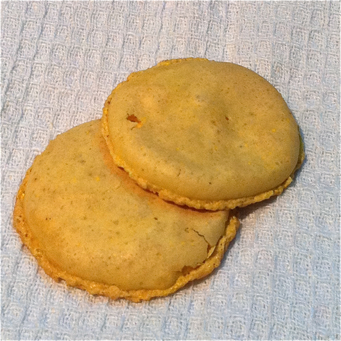 Malheureusement, my first attempt didn’t work so well because, well, the caramel melts in the oven, even when pulverized into a fine powder, and it resulted in pancake-flat macs with a chewey, toffee-like consistency and texture. Well, duh, yeah!