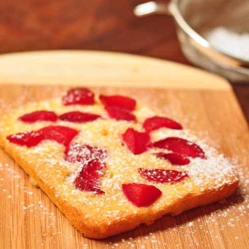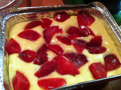 Wow! Check out the color of those plums, would you? They’re like jewels in your summer fruit cake. Luscious!