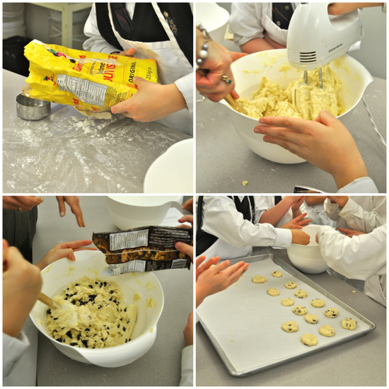 When Kraft Canada contacted me to ask if I would like to bake up some holiday goodies for the “Dessert First” program from Desserts Centre.ca, I knew exactly who I would bake with – Les Petits Chefs! The boys are always asking me to bake but what you can bake in under an hour total time (prep and cooking) is limited. Also, I try to steer clear of the sweet treats as much as I can – I’m trying to teach the boys about real food being really easy from scratch so, whilst it’s great to learn to bake cookies from scratch and not from a Duncan Hines mix, I prefer to stick to savoury and main dishes. But everything in moderation, right – and t’is the season. Also, whilst perusing the recipes on the dessert centre site, I was impressed with how many there were which COULD be prepared in under an hour… So I went all ambitious and decided to make two – White Christmas Crunch Squares and Chocolate (chip) Shortbread Cookies. Since I am still feeling a little under the weather from a sinus infection and the consequences of strong antibiotics, I called for reinforcements on Monday, knowing that it could get crazy in the kitchen lab. So thank you to Ms Stephenson for coming to my rescue – we definitely could not have done this without her!