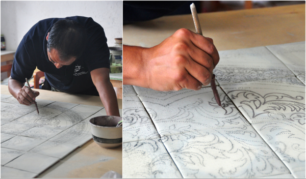 Now they are ready for decorating – a painstaking process undertaken by HAND. First stencilled, then painted and coloured, then glazed one final time.
