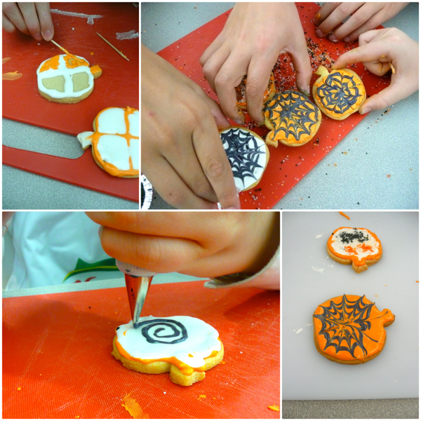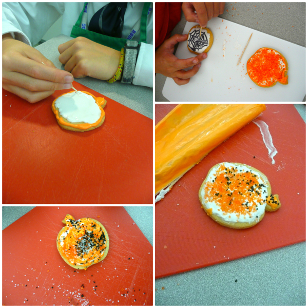Les Petits Chefs were fortunate enough to welcome Adell Shneer back into the lab this week for her FIFTH visit (she’s come before to make cheese blintzes, help our with our Food Revolution Day event, make Pad Thai and soup and pasta and each time, we’ve all had so much fun!). When she suggested something with a Hallowe’en theme for this session a few weeks ago, I knew the boys would love it. My only caveat was that it had to be something challenging for them. Adell came up with the idea of making some sugar cookies and bringing them in for the boys to decorate with proper Royal Icing so she could show them some techniques (making a border around the edge then filling the cookie with icing and using toothpicks to make patterns in the icing).