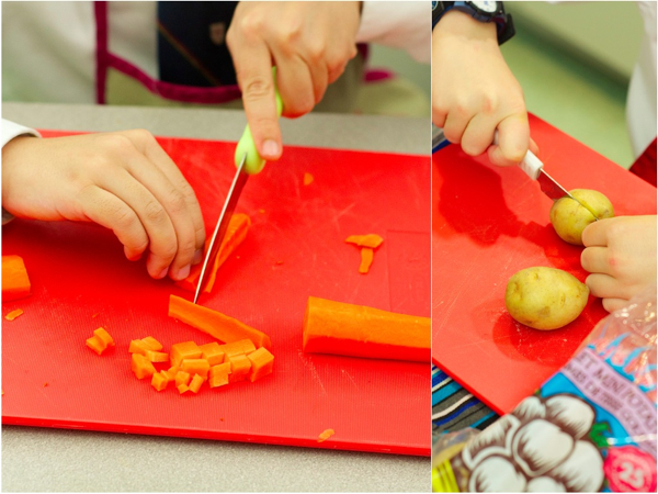 It was a bit of a crazy day for me yesterday and I only finished teaching 15 minutes before club started so it wasn’t much time to do my usual mise en place setup for the guys. It wasn’t my usual uber-organisation on a Monday afternoon but sending the guys off just over an hour later with tupperwares of mashed potatoes (yup, sans the brown butter) made me realise what you CAN do in a short period of time in less than ideal circumstances. So we set to chopping….