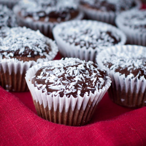 I’ve only had some crumbs of this but was impressed with the texture, the “crumb” and the fluffiness! Win! I frosted them with a simple chocolate ganache and some shredded coconut – because the cake is not so sweet (not much sugar and unsweetened cocoa powder) they can handle the sweet topping. Pretty darned proud of myself!!