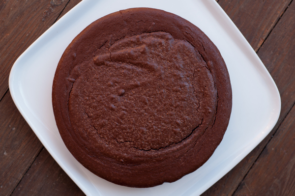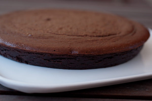 When I read the ingredients – chocolate, sugar, butter, eggs and a 1.5 tablespoons of flour, I thought it might just be like any regular flourless cake. But oh my, this was so much more. The book offers the option to make the cake in the food processor. One bowl instead of many? This dishwasher-less baker was all over that! Basically you melt the chocolate with a sugar and bourbon Cointreau syrup (not a bourbon fan at all – plus we didn’t have any)and blend it for about 15 seconds. Then you add the butter, eggs and flour in sequence and voilà. Cake batter sans all the mess. I am in love with this method.