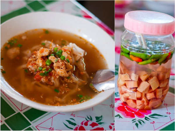 On the table, simple condiments such as pickled chilies and ginger were available for you to help yourself… Below, spicy Shan noodle soup with chicken…