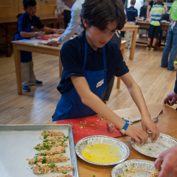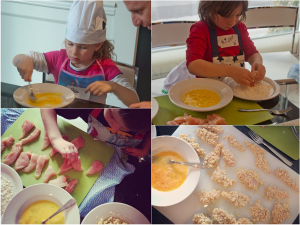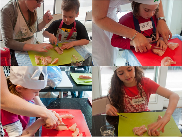 Slicing raw chicken into even-sized fingers… (these kids were great about touching the chicken – even some of my Petits Chefs are still working their way to feeling ok about touching raw meat!)