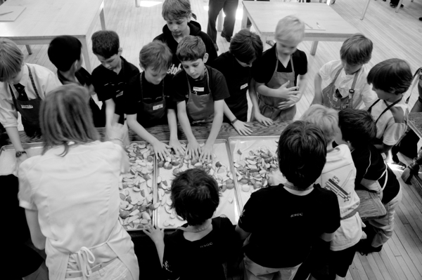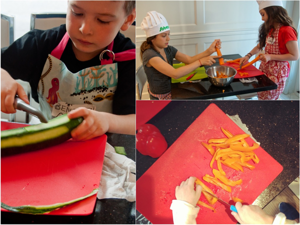 With just 5 kids and 6 adults, it was a much smaller operation but not without its challenges – cooking with kids you don’t know is a little nerve-wracking (“Will they listen to me?!”) because apart from anything else, it’s hard to predict what their skills will be in the kitchen. I love the space at The Kitchen Studio as it’s just like cooking in a home kitchen so it’s not at all intimidating which is important when you have a group of kids who don’t know each other (or me!) cooking together. In any event, I should not have worried – we had a wonderful group of enthusiastic, interested kids which great “can do” attitudes – they jumped right in at every task and completed this meal in a little over 2 hours. Given there were 5 and 6 year-olds in the group, I think this is mighty impressive.