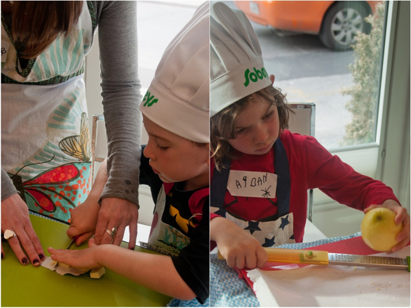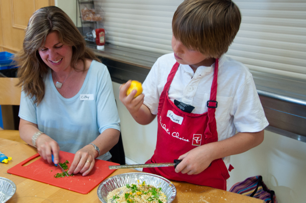 I loved wandering around the room watching parents and their kids hard at work making their dinner. I tried not to intrude too much as they caught up on each others’ days. And, in fact, I didn’t have to. After having the group lesson with Adell, the boys were fairly independent at their stations. I barely had to help at all. Made me so proud 🙂