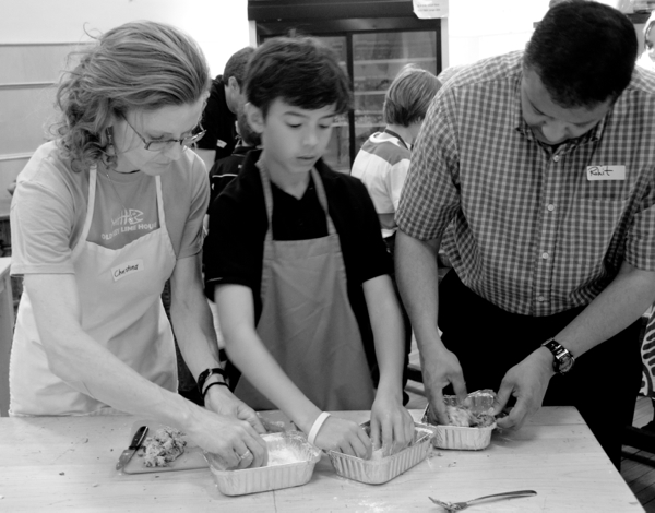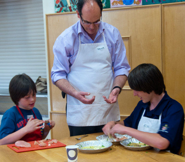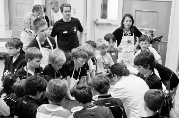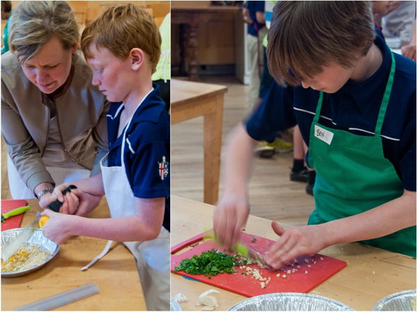 Last Thursday, nearly 60 boys and their family members gathered in our school dining hall to cook and eat together. Guided by the calm, organised Adell, the boys and their families worked through the three meal components in just under 2 hours. Pretty amazing, and made possible with A LOT of help – as well as Adell taking complete charge of the “lesson” part of the evening, I had the ever-calm Michelle (who works with the boys in cooking club every week alongside me), Emilie and Janet (who helped this year with the Cooking Basics club), my mum (because there’s nothing like coming on vacation and being put to work!) and Jacquie and Steve (who, although they were there cooking with their own kids, were able to lend a hand where necessary). A special thanks to Chef Corey who helped me with my food ordering (and countless other tasks) and Karen who just listened and nodded as I planned out my event so she could get the facilities organized, not batting an eyelid at the craziness of it all! The Petits Chefs themselves helped out setting up the dining hall too – it really was a team effort.