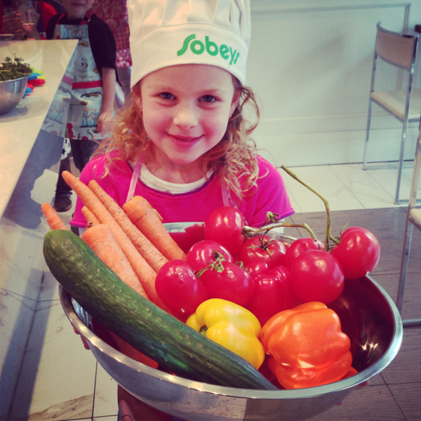 The following day, on Food Revolution Day, I did the class all over again. I was very lucky to have the support of The Kitchen Studio, The Cookbook Store, Sobeys and Yorkshire Valley Farms for this public parent/ child cooking class.