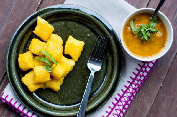 Lentil-ricotta gnocchi panfried in tumeric butter. Because you really want these flavours to shine, you need to keep the serving simple so I chose to serve this with a mango-mint chutney. Flavours you won’t expect in a gnocchi but ones that will delight your tastebuds 🙂