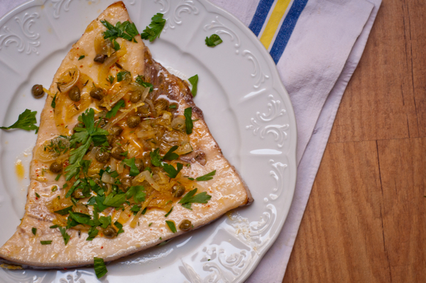 Fortunately at my local poissonnerie, the swordfish was cut into more manageable steaks (even more so than those on the left up there) and I set to marinating them for a few hours in the fridge. The marinade itself is full of good things – lemon zest, lemon juice, onions, capers, olive oil, piment d’Espelette, salt and rosemary (we actually used thyme cos that’s what we had and it worked well).