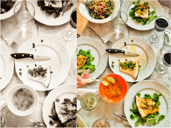 The marinade is re-heated while the fish is cooking to make a sauce which is served with the fish. We didn’t do the “frilly herb salad” that is meant to go with this (parsley and fresh herb leaves basically), opting to serve the fish on some mâche with the sauce on top, sprinkled with parsley. We served it with a new-to-me-but-rapidly-becoming-a-favourite red rice and green bean salad from Clotlide Dusoulier‘s new book (watch this space for a review and giveaway soon!) and it was pretty perfect for a hot Paris evening dinner.