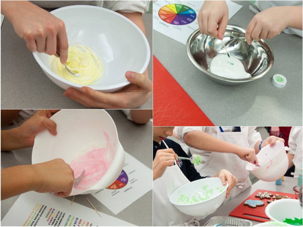 We had a smallish crew of boys this week, losing a few to basketball, but there was no less enthusiasm in the room. Again, Adell went over colour theory with the boys just quickly before she let them colour their royal icing…