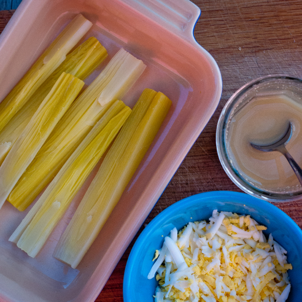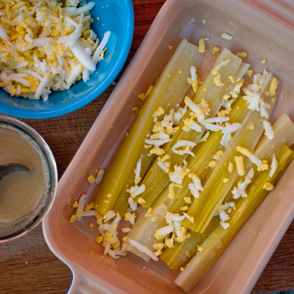 This week’s French Fridays with Dorie recipe was a surprising hit in our household. I have to admit that Leeks Vinaigrette with Mimosa (p 111) – a “classic dish” of tender leeks bathed in vinaigrette (made with walnut oil) topped with grated hard-boiled egg (which resembles mimosa flowers, hence the name) – didn’t really sound like much but it really worked well!