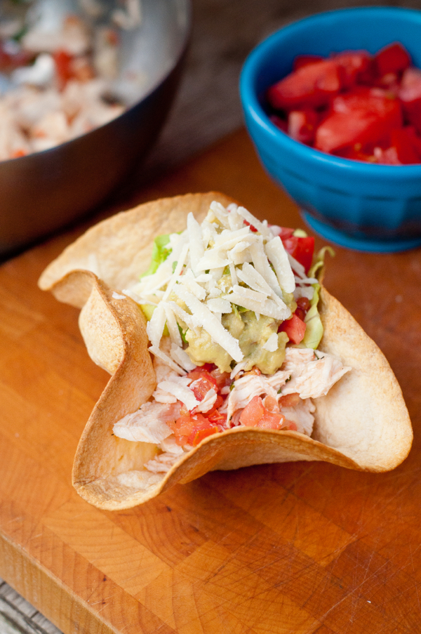 - Mix the chicken with the salsa and divide evenly between the 4 tortilla bowls.
