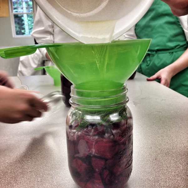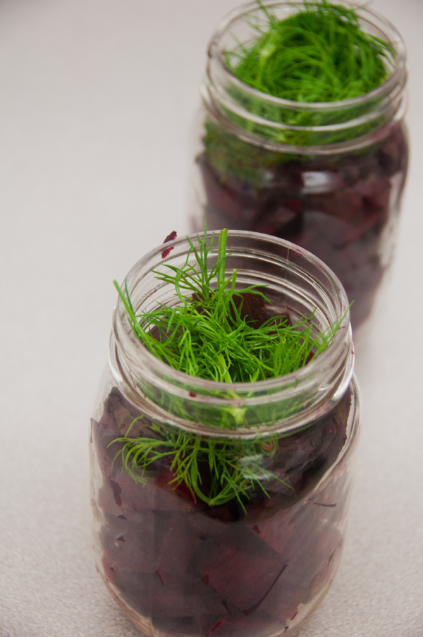 Once the beets were peeled, we washed them again, then chopped them into rough cubes. We filled our jars with the beets, topped them with a little dill…