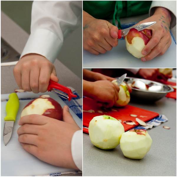 We started out with the apple butter and a lot of apple peeling. We had very shiny apples so they were a little hard to peel with the vegetable peelers but the boys managed pretty well with the knives.