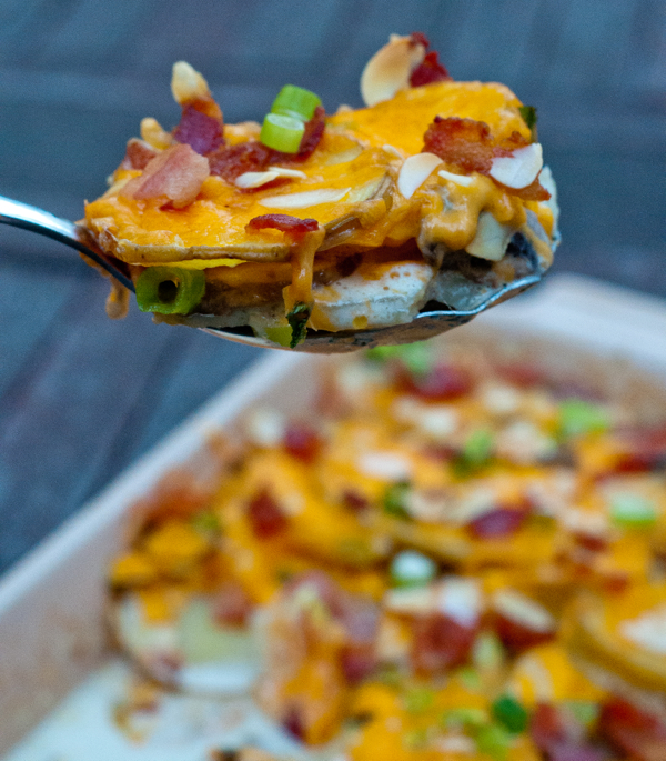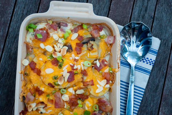 Mmmm… it’s an easy potato gratin baked with cheese and bacon and topped with slivered almonds and green onions.