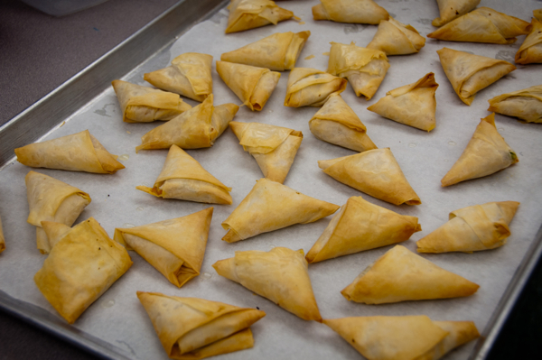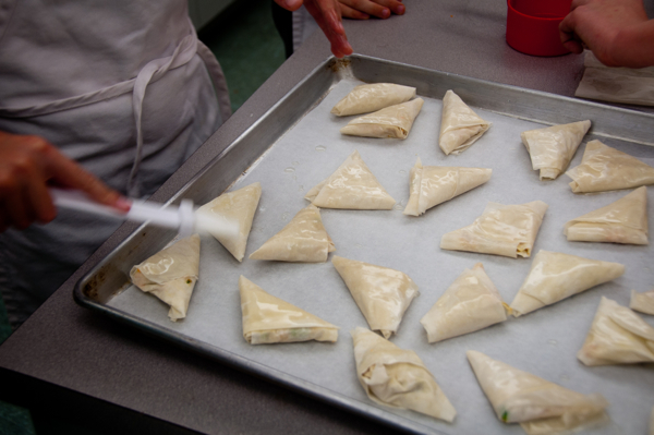 When I brought the tray into the kitchen to bake them, our chef was interested to see these being baked not fried. The phyllo is brushed with a little vegetable oil on top to crisp them up and honestly, I don’t think you could tell the difference (although, I never even got to taste these because there were *exactly* 3 per boy. And we’re all about making sure everyone has the same amount of everything!). I have the leftover filling in my freezer so I’ll definitely try these soon. I can’t wait!